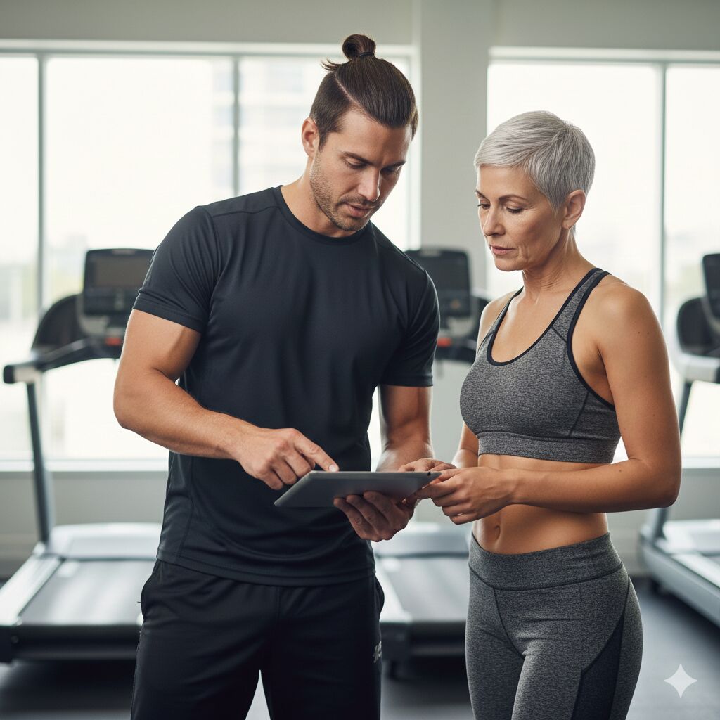 É uma orientação sob medida on-line ou presencial via sessões individuais (50min) de exercício físico com prescrição detalhada filmada e em PDF, e suporte via WhatsApp.